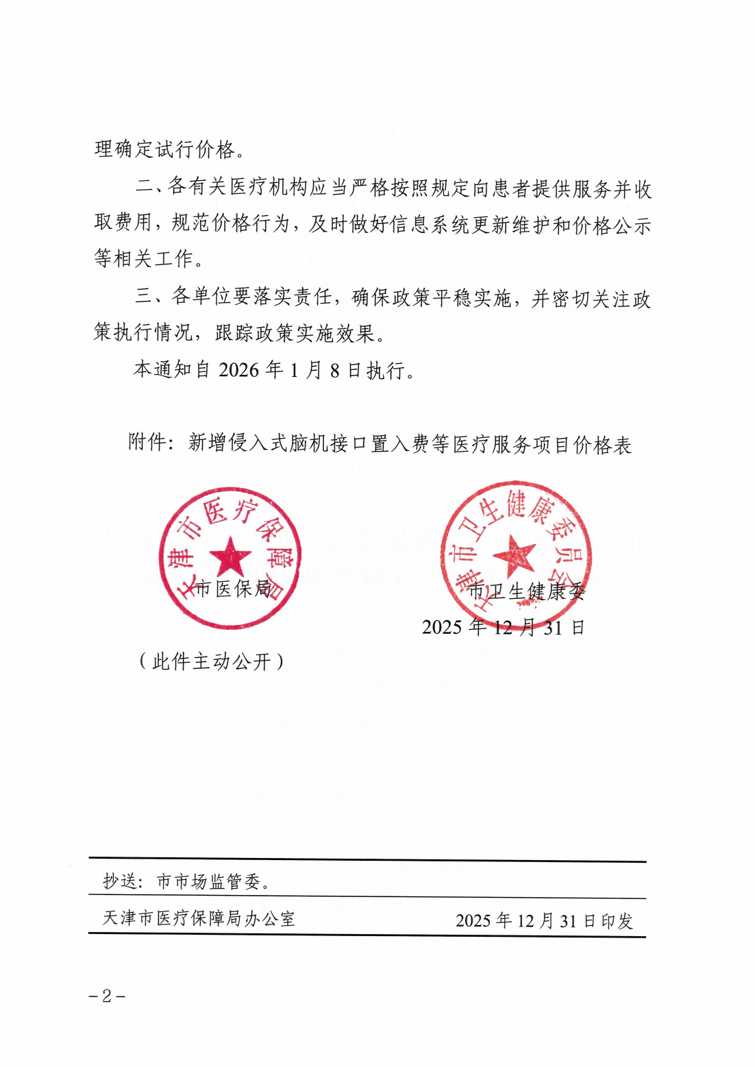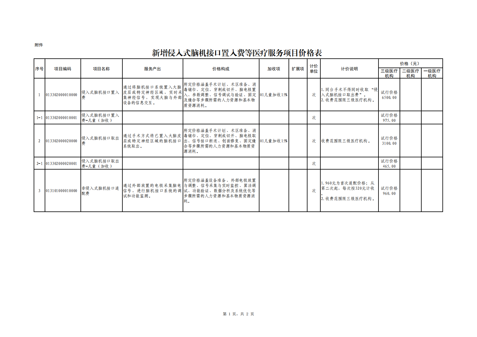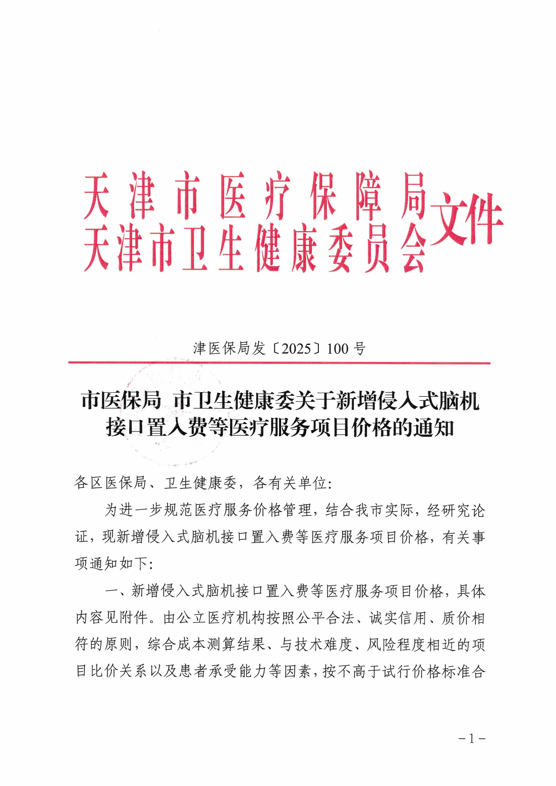 关于新增侵入式脑机接口置入费等医疗服务项目价格的通知 津医保局发〔2025〕100号 市医保局 市卫生健康委关于新增侵入式脑机接口置入费等医疗服务项目价格的通知 附件-新增侵入式脑机接口置入费等医疗服务项目价格表(1)