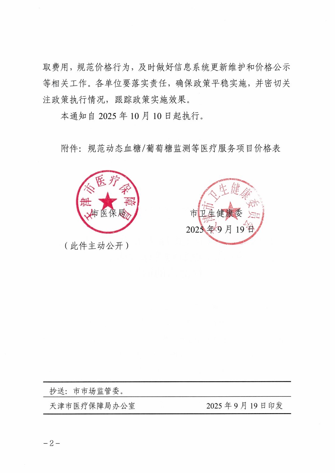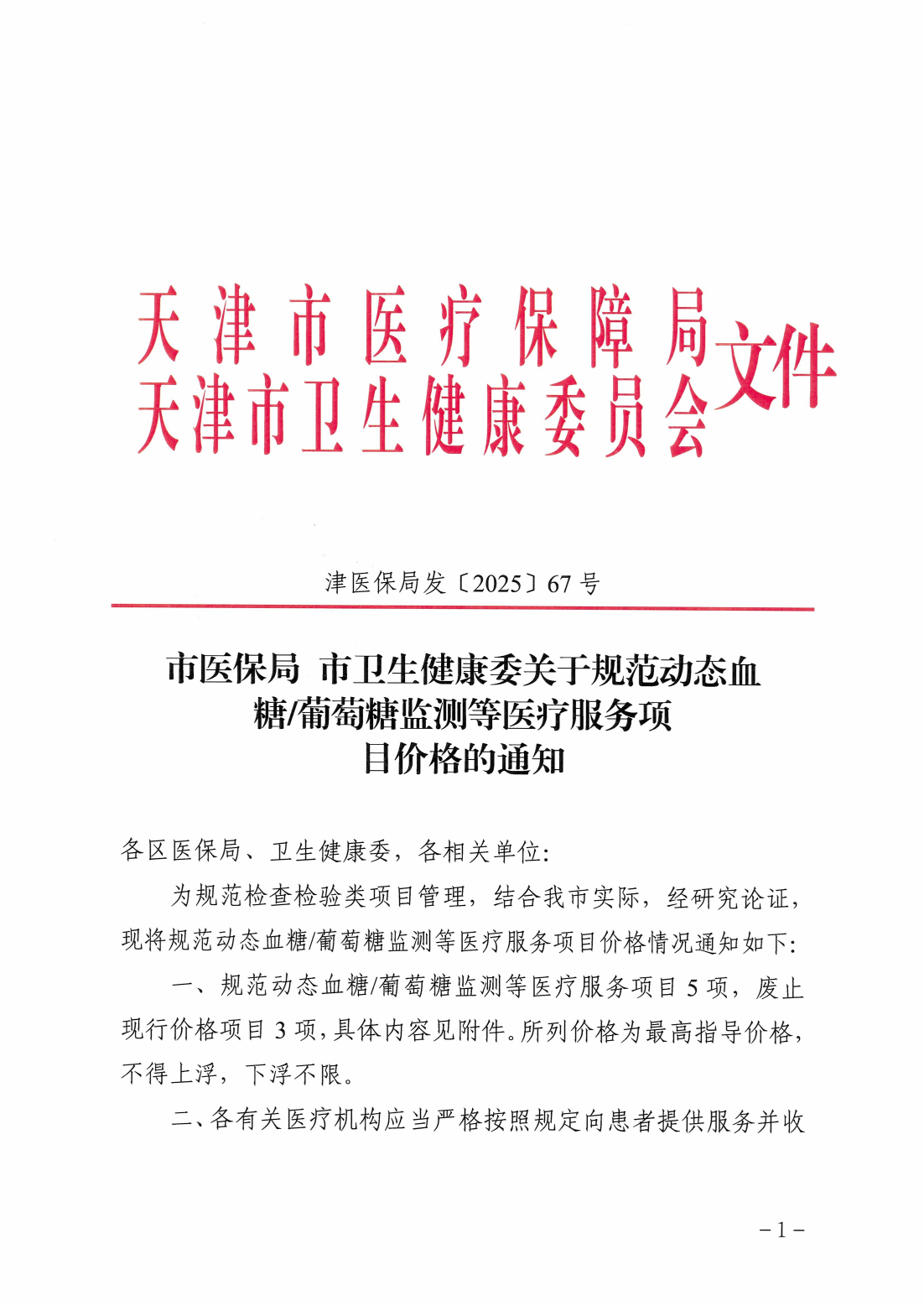 关于规范动态血糖_葡萄糖监测等医疗服务项目价格的通知 津医保局发〔2025〕67号 市医保局 市卫生健康委关于规范动态血糖_葡萄糖监测等医疗服务项目价格的通知附件:规范动态血糖葡萄糖监测等医疗服务项目价格表