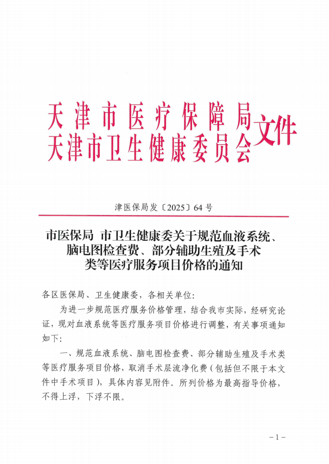 津医保局发〔2025〕64号 市医保局市卫健康委关于规范血液系统脑电图检查费、部分辅助生殖及手术类等医疗服务项目价格的通知附件1-8:规范血液系统、脑电图检查费、部分辅助生殖、部分手术类医疗服务项目价格表