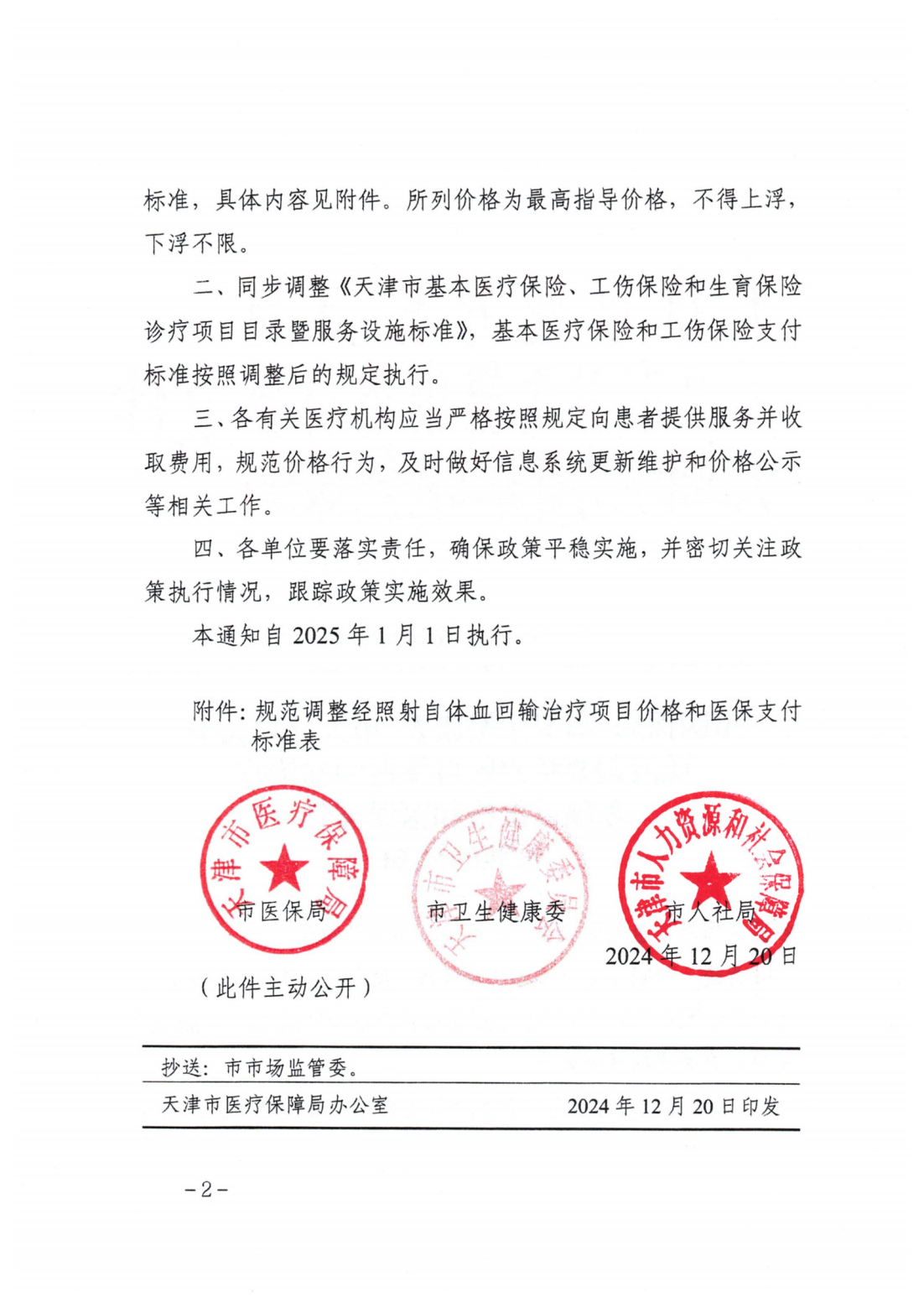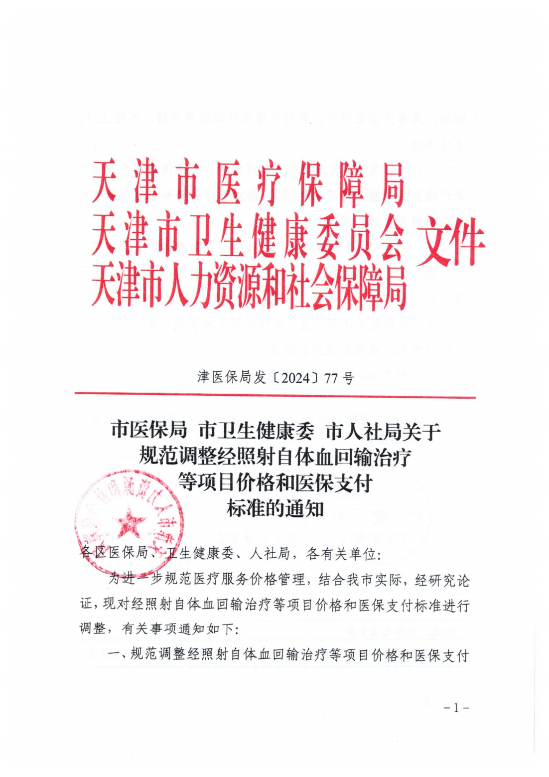 关于规范调整经照射自体血回输治疗等项目价格和医保支付标准的通知 津医保局发〔2024〕77号 市医保局 市卫生健康委 市人社局关于规范调整经照射自体血回输治疗等项目价格和医保支付标准的通知附件:规范调整经照射自体血回输治疗等项目价格和医保支付表