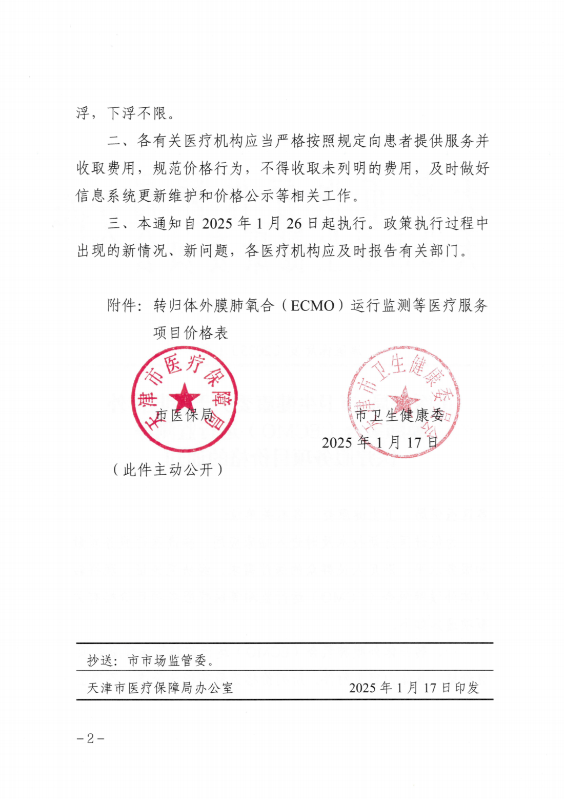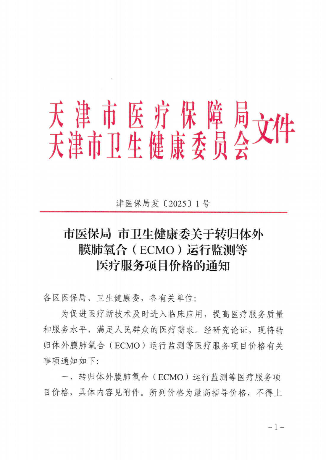 津医保局发〔2025〕1号 市医保局 市卫生健康委关于转归体外膜肺氧合(ECMO)运行监测等医疗服务项目价格的通知