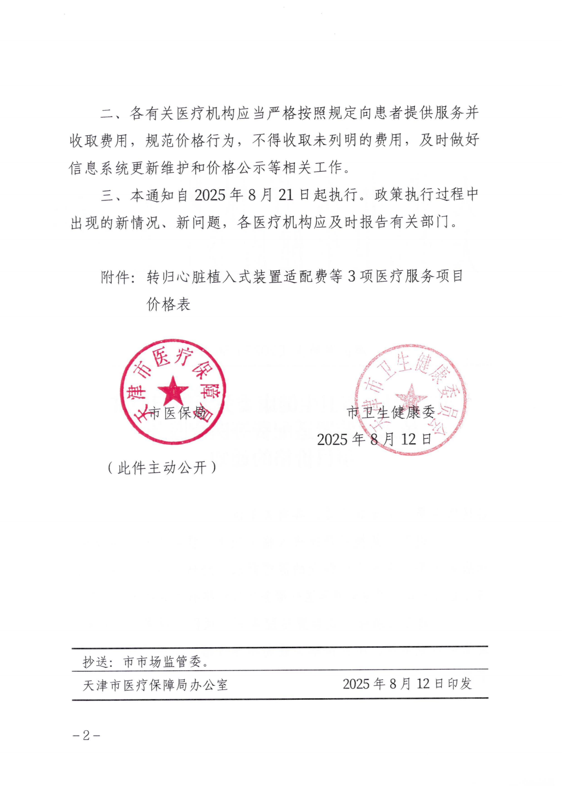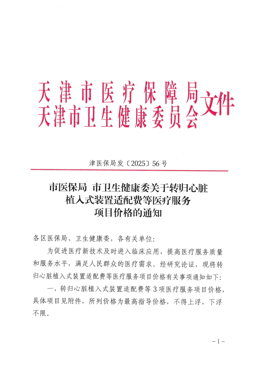 关于转归心脏植入式装置适配费等医疗服务项目价格的通知 津医保局发〔2025〕56号 市医保局 市卫生健康委关于转归心脏植入式装置适配费等医疗服务项目价格的通知 附件:转归心脏植入式装置适配费等医疗服务项目价格表 (2)