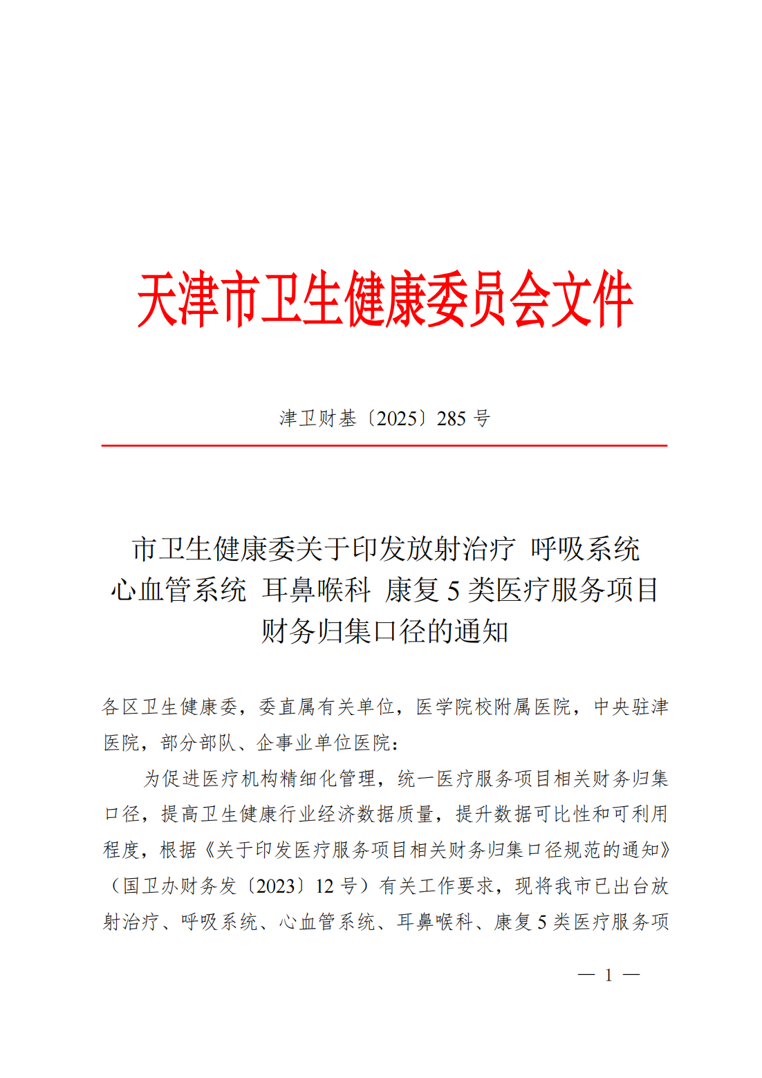 市卫生健康委关于印发放射治疗、呼吸系统、心血管系统、耳鼻喉科、康复5类医疗服务项目财务归集口径的通知